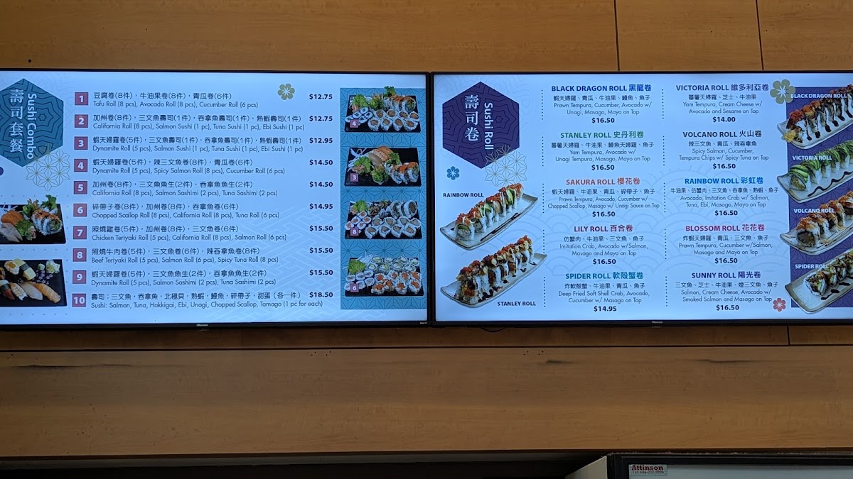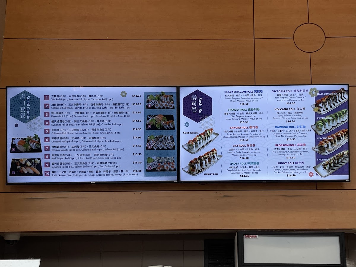 Sushi Rolls feature a variety of options including Stanley Roll, Sakura Roll, Canucks Roll, Volcano Roll, Victoria Roll, Ocean Roll, Sunny Roll, Green Dragon Roll, Red Dragon Roll, Queen's Roll, Tasty Roll, and Flaming Dragon Roll. These rolls offer a range of ingredients and flavors typical of sushi menus.
